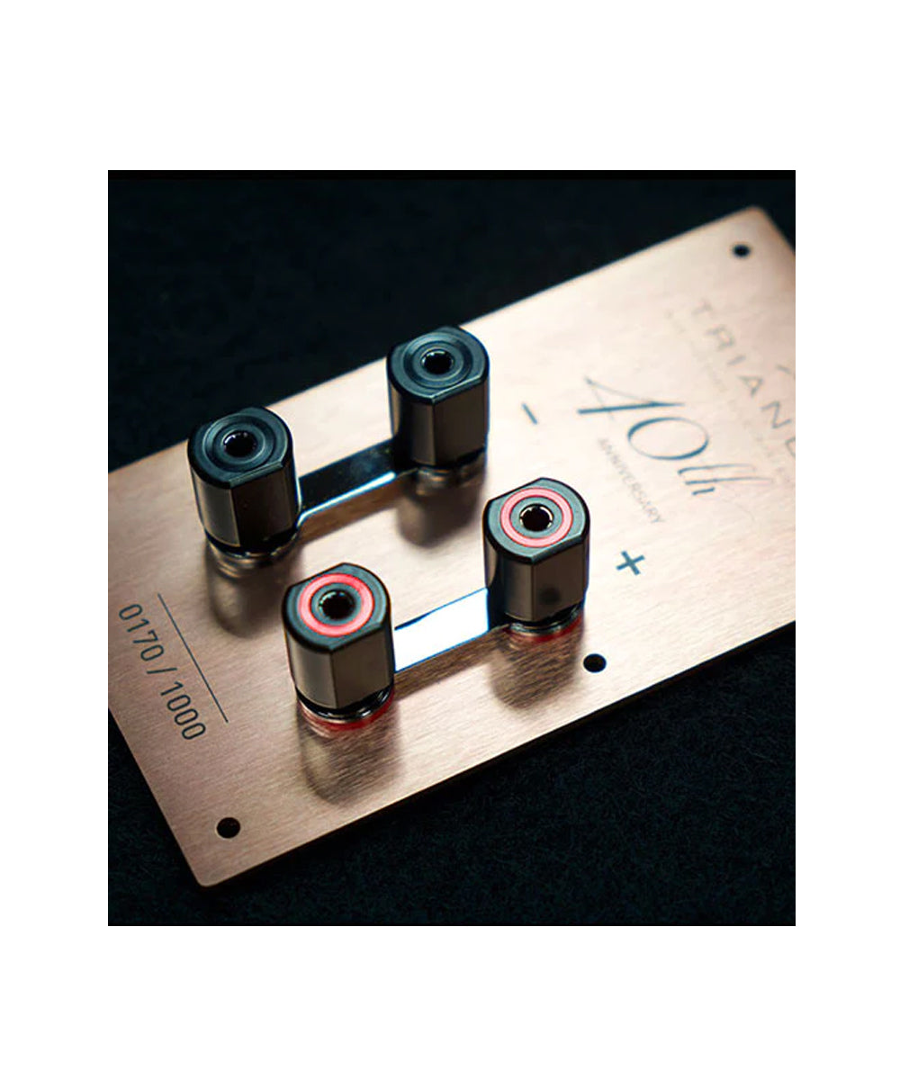 The terminals of the 40th Anniversary range are in rose gold anodized brushed aluminum.  The custom-designed, insulated terminals can accommodate a 5mm diameter cross-section cable. They can also accommodate banana plugs with a locking system.