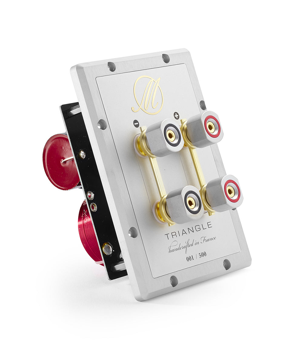 The terminal is manufactured in a block of aluminum, reaching a thickness of 11mm. The terminals are made of pure copper then gold plated for a perfect electrical conduction. It allows for bi-wiring and bi-amplification. On the floorstander models, the crossover is done on separate boards for the bass and the medium/high. To do this, you just need to remove the jumpers.