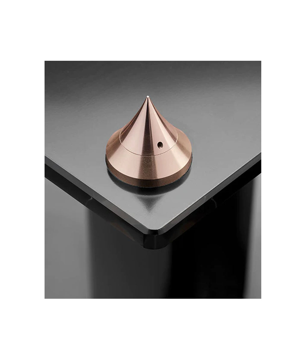 TRIANGLE’s approach for the loudspeaker is the same. So, we decided to put three quarters of the speaker on a base. However, for the system to be highly efficient, it was necessary to insert an interface made of an inert polymer between the base and the cabinet. From then on, we could consider that the enclosure was almost completely isolated mechanically from the floor. We only had to capture a large part of the vibrations of the enclosure and its energy on the remaining front quarter and transfer it directly to the ground. This principle combined with the SPEC system eliminates any transmission to the ground.