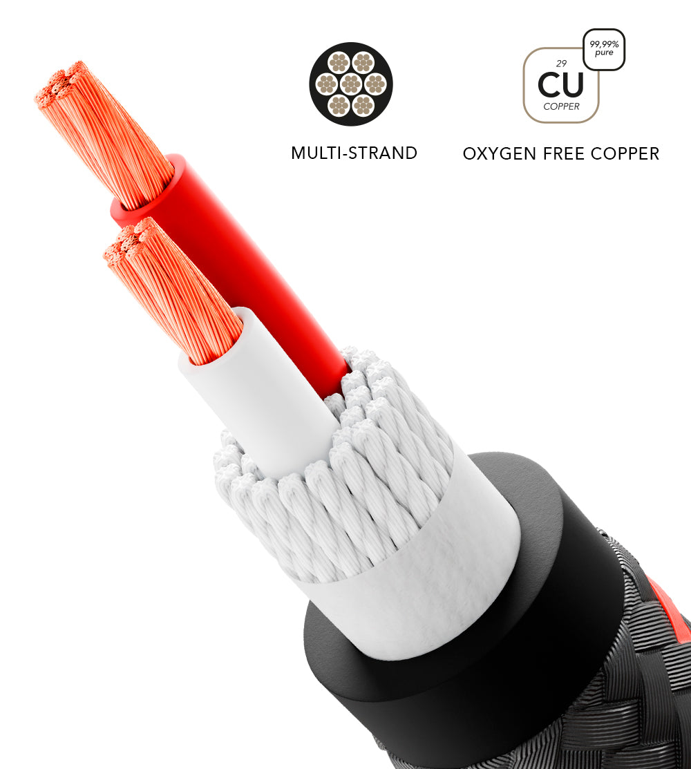 With a total cross-section of 2x2.5mm², the conductor core consists of a total of 7 braids, each composed of 32 OFC (Oxygen Free Copper) strands.